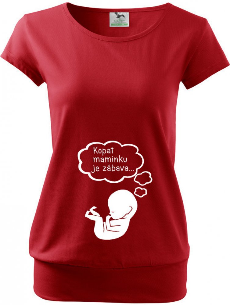 Kopat maminku je zábava! :) Tričko pro těhotné maminky s potiskem dokonale vystihuje pocity každé maminky, když děťátko v bříšku zlobí. Těhotenské tričko s miminkem a bublinou s nápisem je velmi populární. Na přání jsme schopni text v bublině jakkoliv upravit.