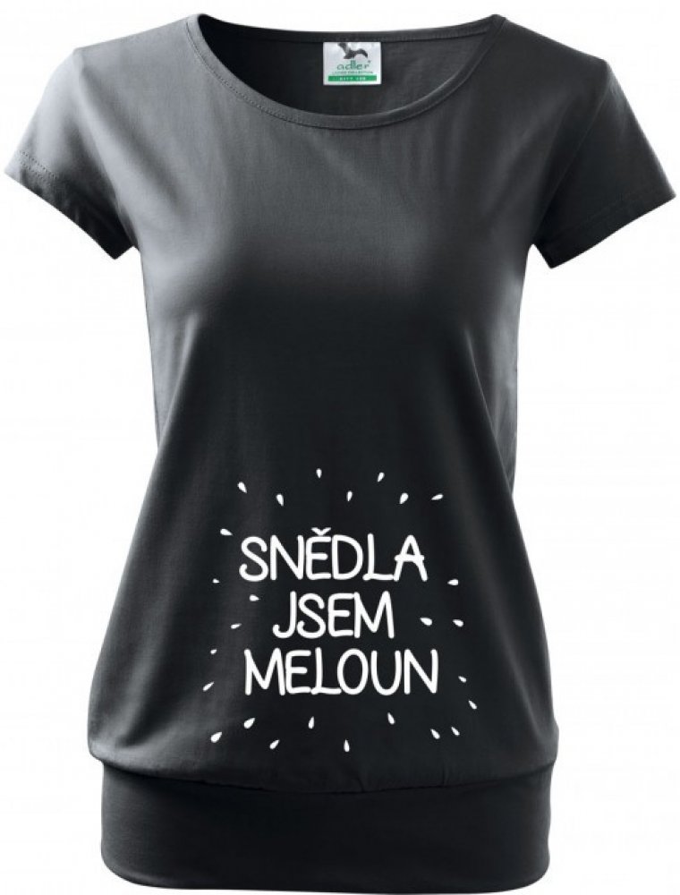 Těhotná? Ale kdepak, to jsem jen snědla meloun. Vtipné tričko s potiskem pro každou nastávající maminku rozesměje každého a originálně upozorní na to, že se něco velkého chystá! Potisk s "melounem" je vyveden na bříšku a není nijak křiklavý. Decentně sedí k barvičkám našich triček.