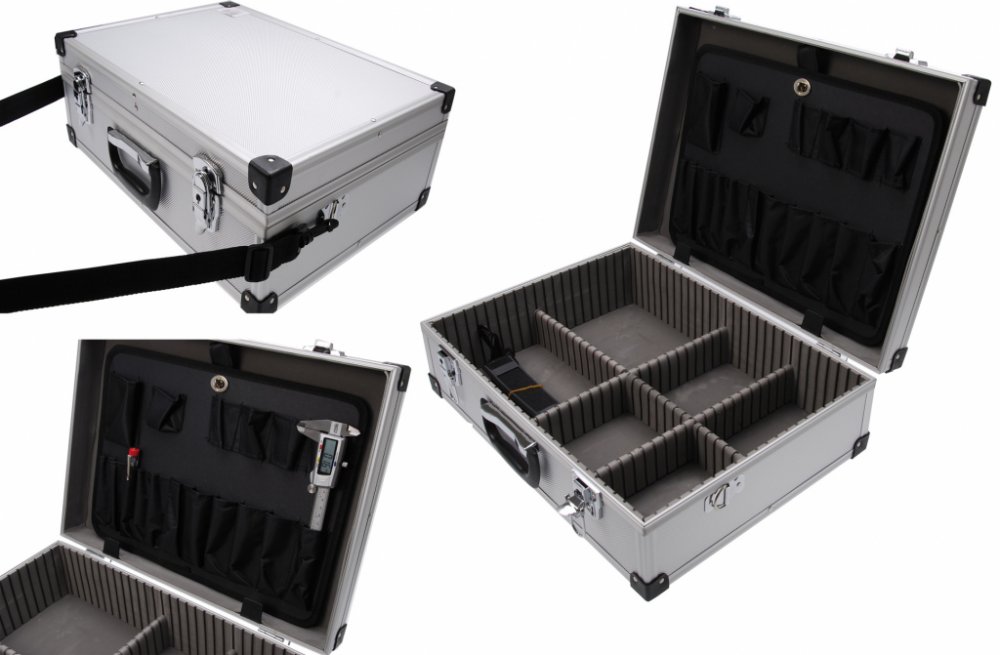 Kufr BGS technic – hliníkový, stříbrný Materiál: Hliník Provedení: Stříbrný Rozměry [mm]: 150 × 330 × 460 S nastavitelnými přepážkami ve čtyřech směrech Vč. panelu nástrojů a popruhu na přenášení Vnitřní rozměry (dole) 320 × 440 × 95 mm Vnitřní rozměry (víko) 320 × 440 × 40 mm (bez panelu nástrojů)