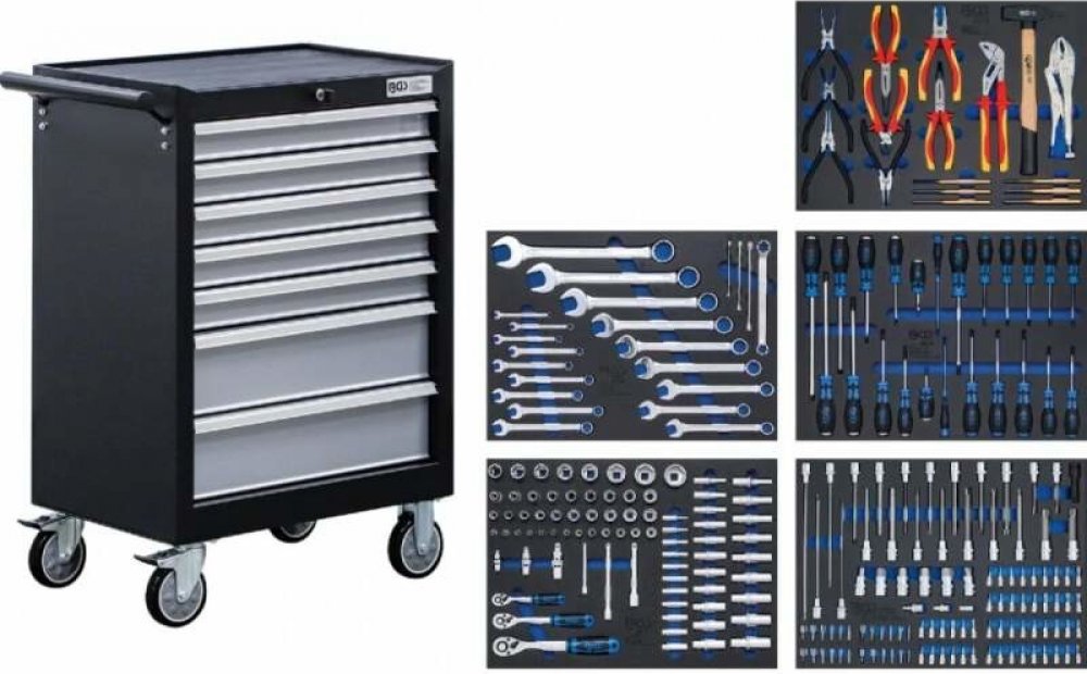 Samotný vozík obsahuje 7 uzamykatelných zásuvek vybavených nářadím v pěnových výplních. Zásuvky jsou rozděleny do dvou velikostí s nosností 20 - 25 kg.