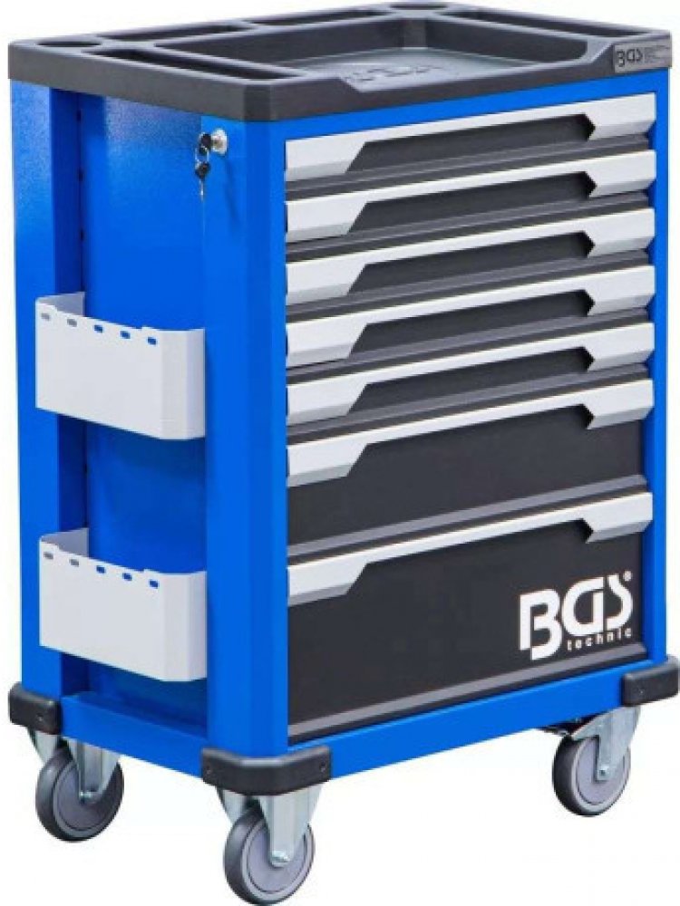 vysoce kvalitní design dílnyrobustní konstrukce z ocelového plechupráškově lakované tělo, obzvláště odolné proti poškrábáníodolná kolečka s kuličkovými ložisky, včetně 2 uzamykatelných otočných kolečeks bočním madlem pro snadné manévrováníuzamykatelné pomocí centrálního zámkuprůběžné lišty na rukojetiOchrana hran na všech čtyřech rozích7 zásuvek s hladkým chodem a kuličkovými ložisky:1. až 7. zásu...