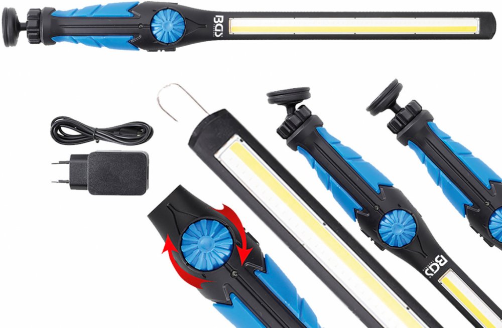 extra plochý design vhodný zejména pro osvětlení úzkých prostor přepínatelný na ultrafialové světlo (UV) vhodný pro detekci použití ve spojení s fluorescenčním sprejem na detektor netěsností jas plynule nastavitelný pomocí ovládacího knoflíku 1 otočný závěsný háček otočná základna s výkonným magnetem světelný zdroj: 10 W COB LED (hlavní světlo ) Svítivost LED: 800 lumen doba nabíjení akumulátoru: 3,5 h vstup nabíječky: micro USB (nabíjecí kabel součástí balení) indikátor zatížení: LED červená/modrá pracovní teplota: -5 - 50 °C skladovací teplota: -20 - 70 °C rozměry: 477 x 50 x 40 mm hmotnost: ca. 295 g rozsah dodávky: COB-LED / UV pracovní ruční lampa USB nabíječka (výstup: DC 5 V 2000 mA, vstup: AC 100 - 240 V 50/60 Hz) USB-nabíjecí kabel