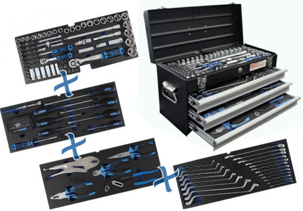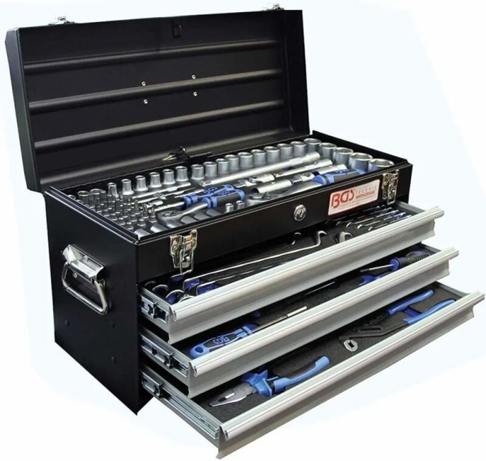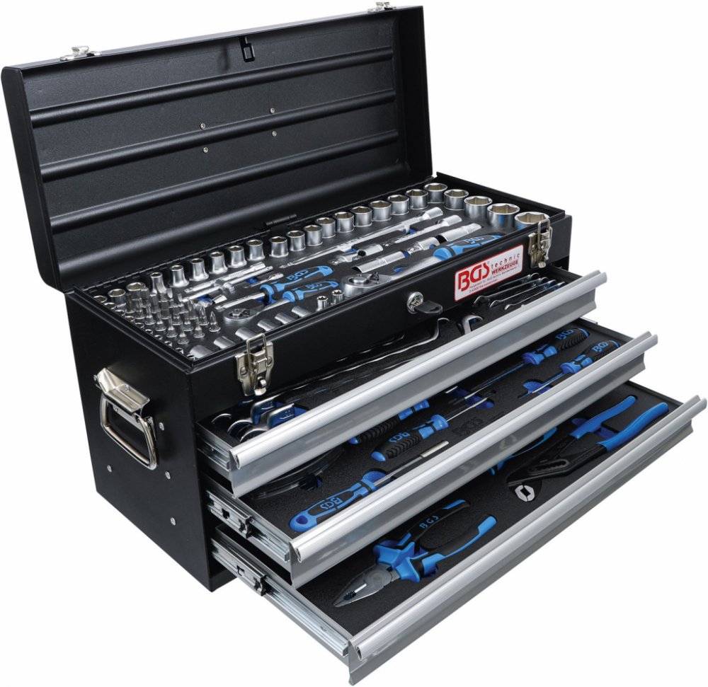 Velká sada ručního nářadí: gola sady 1/4“ a 1/2“, kleště, klíče, šroubováky a bity, 143 dílů v bytelném kovovém kufru (base)– BGS technic 3318 Rozsáhlá a chytře poskládaná souprava nářadí pro autoservis, dílnu, výrobní provozy, ale i pro náročného domácího kutila, který si potrpí na kvalitu svého vybavení. Basa obsahuje často používané vybavení pro mnoho druhů opravárenských či výrobních činností....