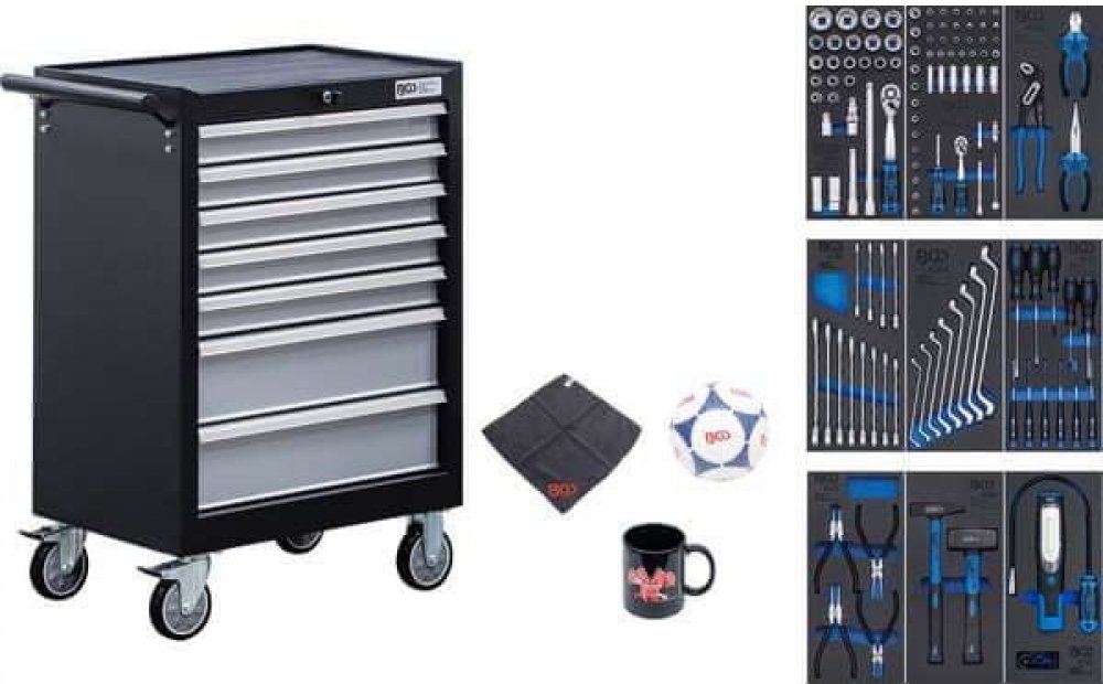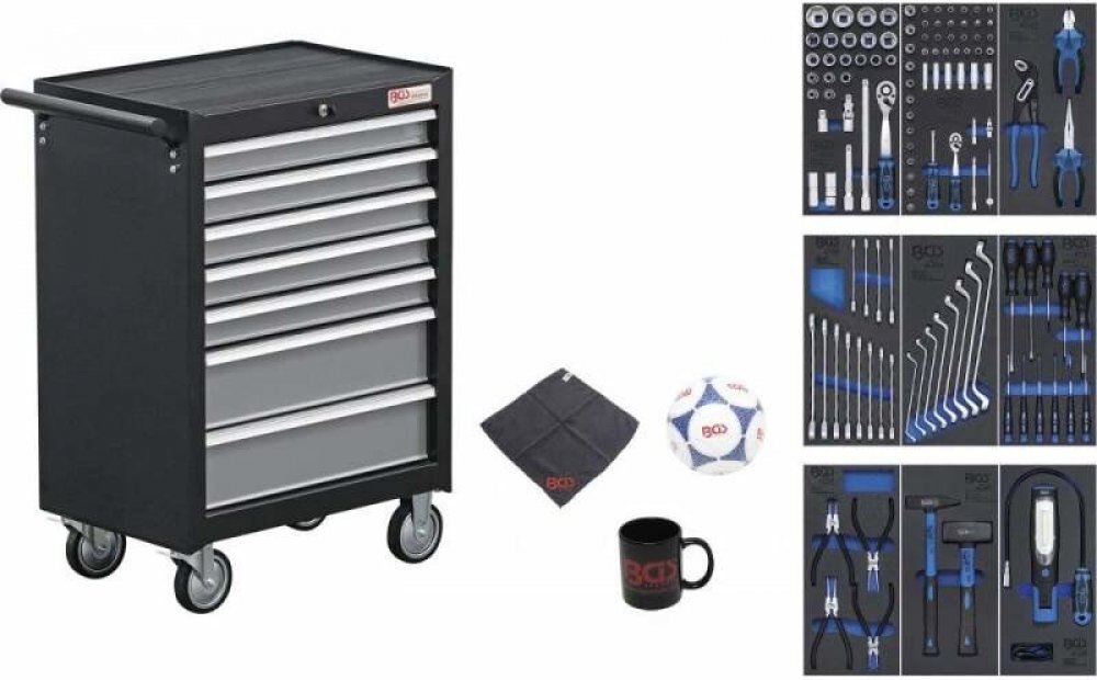 Pojízdný nářaďový vozík BGS technic - 7 zásuvek. Vybavený 120 díly nářadí Přehledně vybavený kvalitní montážní vozík s 7 zásuvkami: Horní odkládací deska 7 zásuvek se 100% výsuvem (5 nízkých - 5 cm, 2 vysoké - 13 cm) Bezpečnostní uzamykací systém (2x klíč) 4 kolečka (2 pevná, 2 otočná s poziční brzdou) určená pro vysoké namáhání Součásti dodávky nářaďového vozíku BGS technic Dílenský vozík (BGS 20...