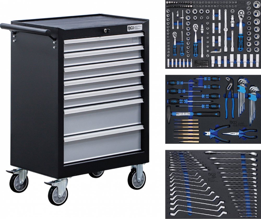 Pojízdný nářaďový vozík BGS technic s 7 zásuvkami a 263 ks nářadí Kvalitní montážní vozík v provedení s 7 zásuvkami: Kvalitní dílenské provedení Stabilní provedení z ocelového plechu Práškově lakovaný korpus, mimořádně odolný proti poškrábání S bočním madlem pro snadnou manipulaci Průběžné úchyty …