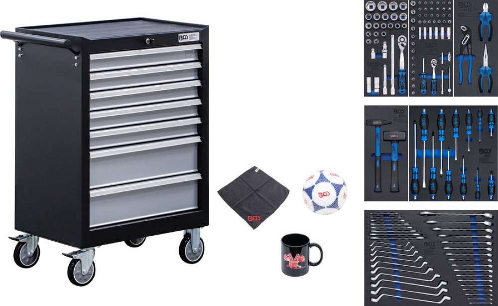 Pojízdný nářaďový vozík BGS technic s 7 zásuvkami a 129 ks nářadí Kvalitní montážní vozík v provedení s 7 zásuvkami: Kvalitní dílenské provedení Stabilní provedení z ocelového plechu Práškově lakovaný korpus, mimořádně odolný proti poškrábání S bočním madlem pro snadnou manipulaci Průběžné úchyty Horní odkládací deska 7 zásuvek se 100procentním výsuvem (5 středních - 59 mm, 2 vysoká - 138 mm) Uzam...