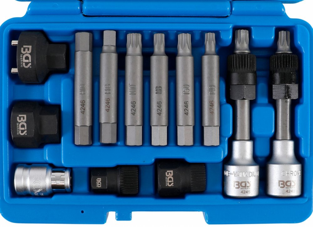 speciální sada bitů s kombinovanými klíči na alternátor (také kompresor klimatizace) pro montáž řemenic klíč řemenice s drážkovanou řemenicí, 15 mm, 33 zubů, vrtaný drážková kladka klíč, 22 mm, 33 zubů, vrtaný adaptér pro kladkový klíč 22 a 28 mm 4pinový adaptér, pohon 17 mm bity, délka 75 mm, vnější šestihran 10 mm (3/8") pohon, vnitřní šestihran H8 a H10 mm bity, délka 75 mm, vnější šestihran 10 mm (3/8") pohon, drážkování (pro XZN) M8 - bity M10 , délka 75 mm, vnější šestihran 10 mm (3/8") pohon, patice T-Star (pro Torx) T40 a T50 bit pro alternátor, Pohon 12,5 mm (1/2"), drážkovaný (pro XZN) M10 bitová zásuvka pro alternátor, pohon 12,5 mm (1/2"), T-Star (pro Torx) T50 Adaptér bitu s přídržnou kuličkou, pohon 12,5 mm (1/2") - vnitřní šestihran 10 mm (3/8") obsahuje adaptéry pro VW, Audi, Seat, BMW, Mercedes-Benz , Ford