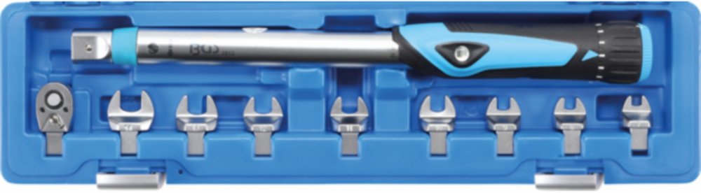 Materiál: Chrom vanadium Momentový klíč s výměnnými nástavci 9 x 12 mm s automatickým uvolňováním včetně signálu Nastavení hodnoty momentu pomocí šroubu - stupnice s lupou Dodáváno s kalibračním certifikátem V plastové kazetě včetně 8 ks otevřených klíčů a přepínací ráčnové hlavy 1/4"