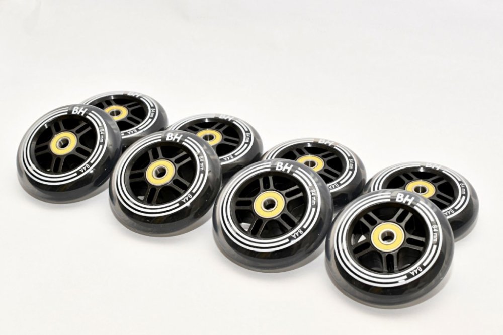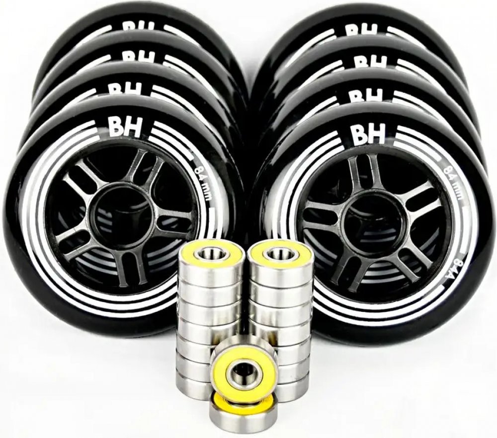 Kompletní sada koleček a ložisek pro 1 pár in-line bruslí za zvýhodněnou cenu! Obsahuje: 8x kolečko značky BH - průměr 84mm, tvrdost 84A, průměr hubu (loukoťového středu) 54mm. Jedná se o komfortní, ale zárověň velmi rychlá kolečka pro fitness bruslení, díky kvalitní PU směsi mají výbornou životnost. 16x ložisko ABEC 9 - materiál chrome steel, velikost 608, typ RS. Ložiska vyrobená z vysoce kvalitní chromové oceli, jsou vybavena oboustranným těsněním, které zaručuje nízké tření, ochranu před prachem a vlhkostí, a součastnou možností ložiska čistit. 8x spacer určený pro podvozkové šrouby o průměru 8 mm. Materiál carbon steel. **kolečka a ložiska jsou dodávána zvlášť, obrázek má pouze ilustrativní charakter