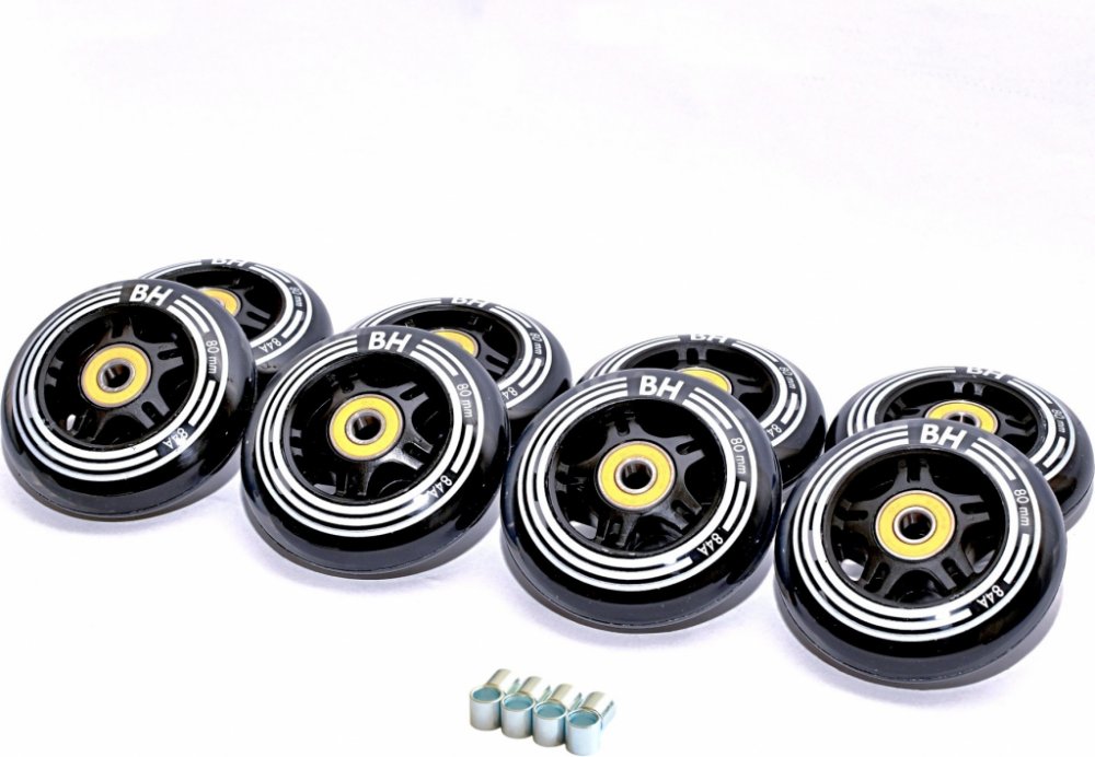 Kompletní sada koleček a ložisek pro 1 pár in-line bruslí za zvýhodněnou cenu! Obsahuje: 8x kolečko značky BH - průměr 90 mm, tvrdost 84A, velikost středu 50 mm (jedná se o komfortní, ale zároveň velmi rychlá kolečka pro fitness bruslení, díky kvalitní PU směsi mají výbornou životnost.) 16x ložisko ABEC 9 - materiál chrome steel, velikost 608, typ RS (ložiska vyrobená z vysoce kvalitní chromové oceli, jsou vybavena oboustranným těsněním, které zaručuje nízké tření, ochranu před prachem a vlhkostí, a současnou možností ložiska čistit)