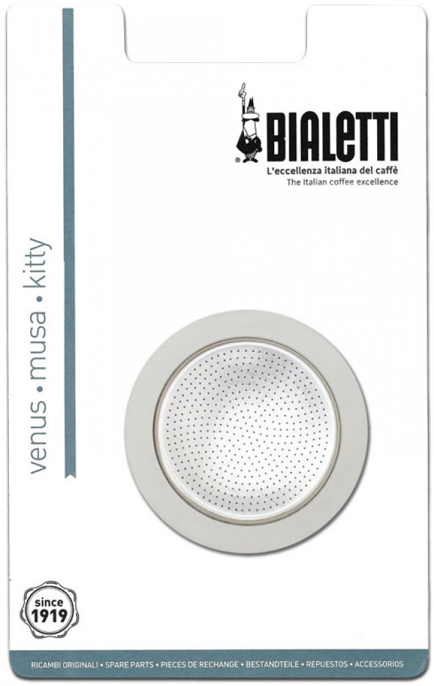Balení obsahuje 1x náhradní silikonové těsnění pro nerezové moka konvičky Bialetti ve velikosti 10 šálků a současně 1x náhradní nerezové sítko.