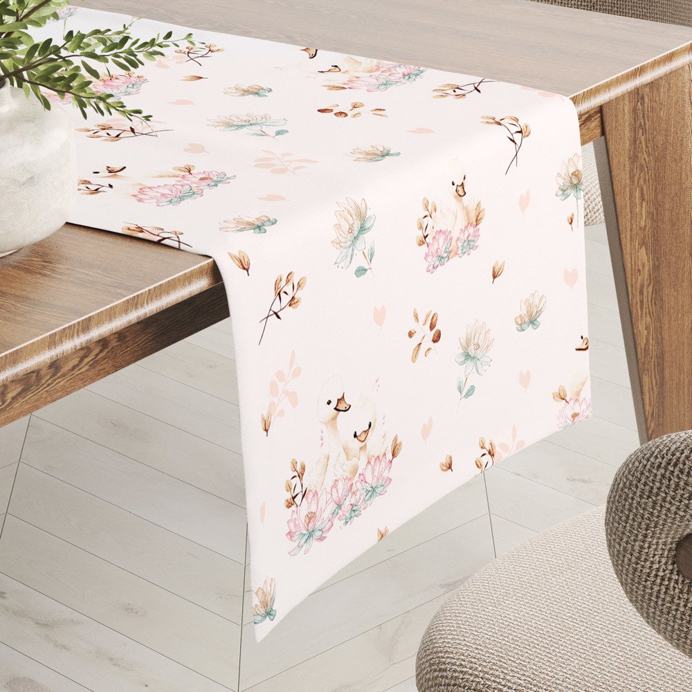Dekorační běhoun na jídelní stůl se vzorem roztomilých labutí v pastelových barvách mezi lekníny na bílém podkladu.