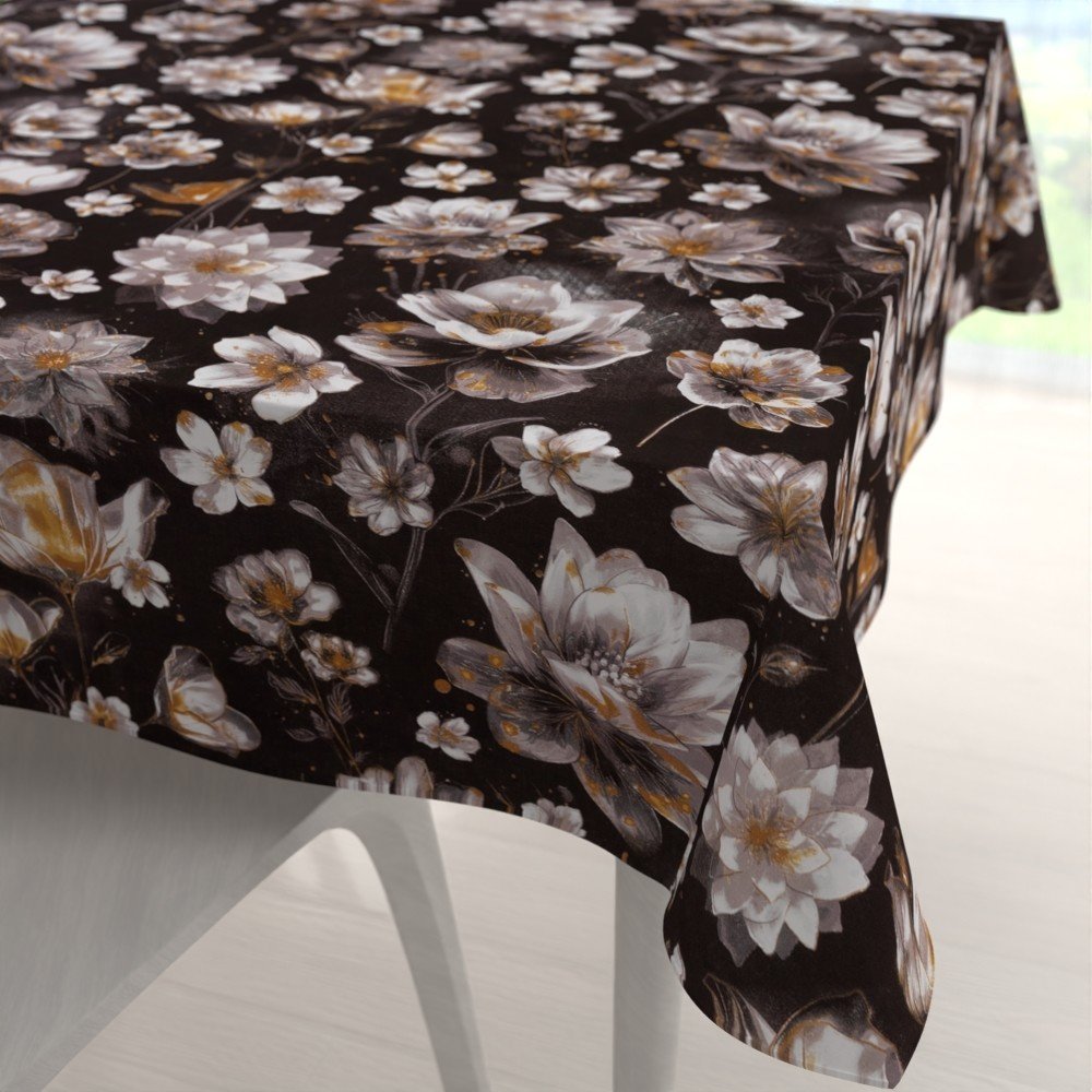 Bavlněný čtvercový dekorační ubrus na stůl se vzorem magických leknín na temně hnědém podkladu. Je ušitý z hustě tkaného 100% bavlněného plátna s certifikátem zdravotní nezávadnosti Oeko-Tex 100. Ubrus dodáváme kompletně obšitý.