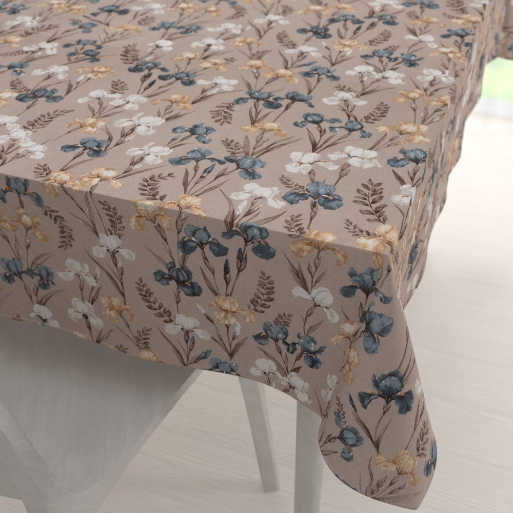 Bavlněný obdélníkový dekorační ubrus na stůl se vzorem modro-béžovo-bílých kosatců na šedobéžovém podkladu. Je ušitý z hustě tkaného 100% bavlněného plátna s certifikátem zdravotní nezávadnosti Oeko-Tex 100. Ubrus dodáváme kompletně obšitý.
