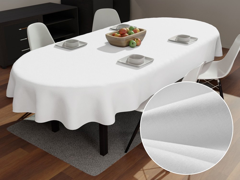 Bavlněný jednobarevný oválný ubrus na stůl v bílé barvě. Je ušitý z hustě tkaného 100% bavlněného plátna s certifikátem zdravotní nezávadnosti Oeko-Tex 100. Ubrus dodáváme kompletně obšitý.