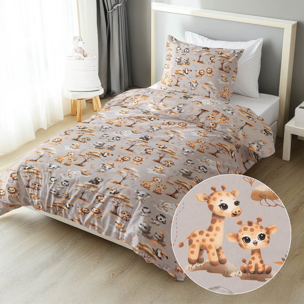 Bavlněné ložní povlečení se vzorem afrických zvířátek na šedém podkladu. Je ušité z hustě tkaného 100% bavlněného plátna s certifikátem zdravotní nezávadnosti Oeko-Tex 100. Bavlněná povlečení jsou vhodná pro celoroční použití.