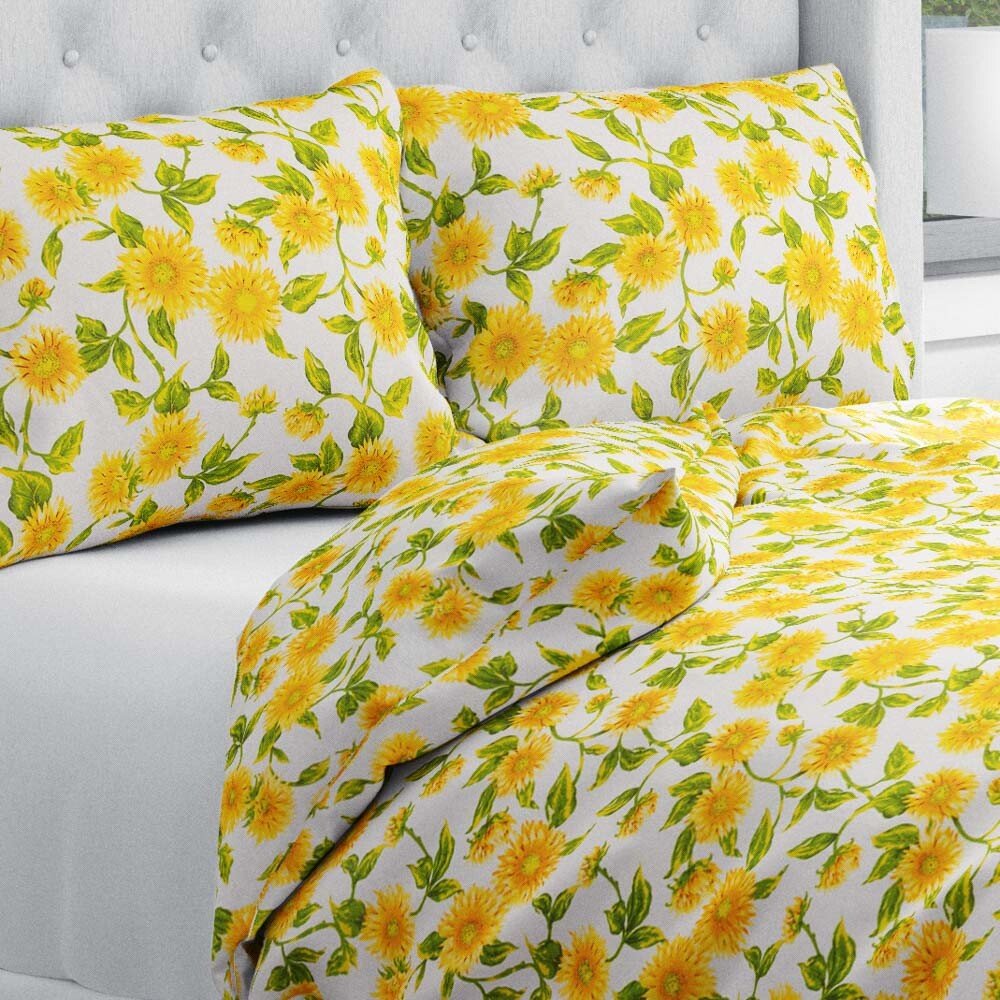 Bavlněné ložní povlečení se vzorem slunečnic na bílém podkladu. Je ušité z hustě tkaného 100% bavlněného plátna s certifikátem zdravotní nezávadnosti Oeko-Tex 100. Bavlněná povlečení jsou vhodná pro celoroční použití.