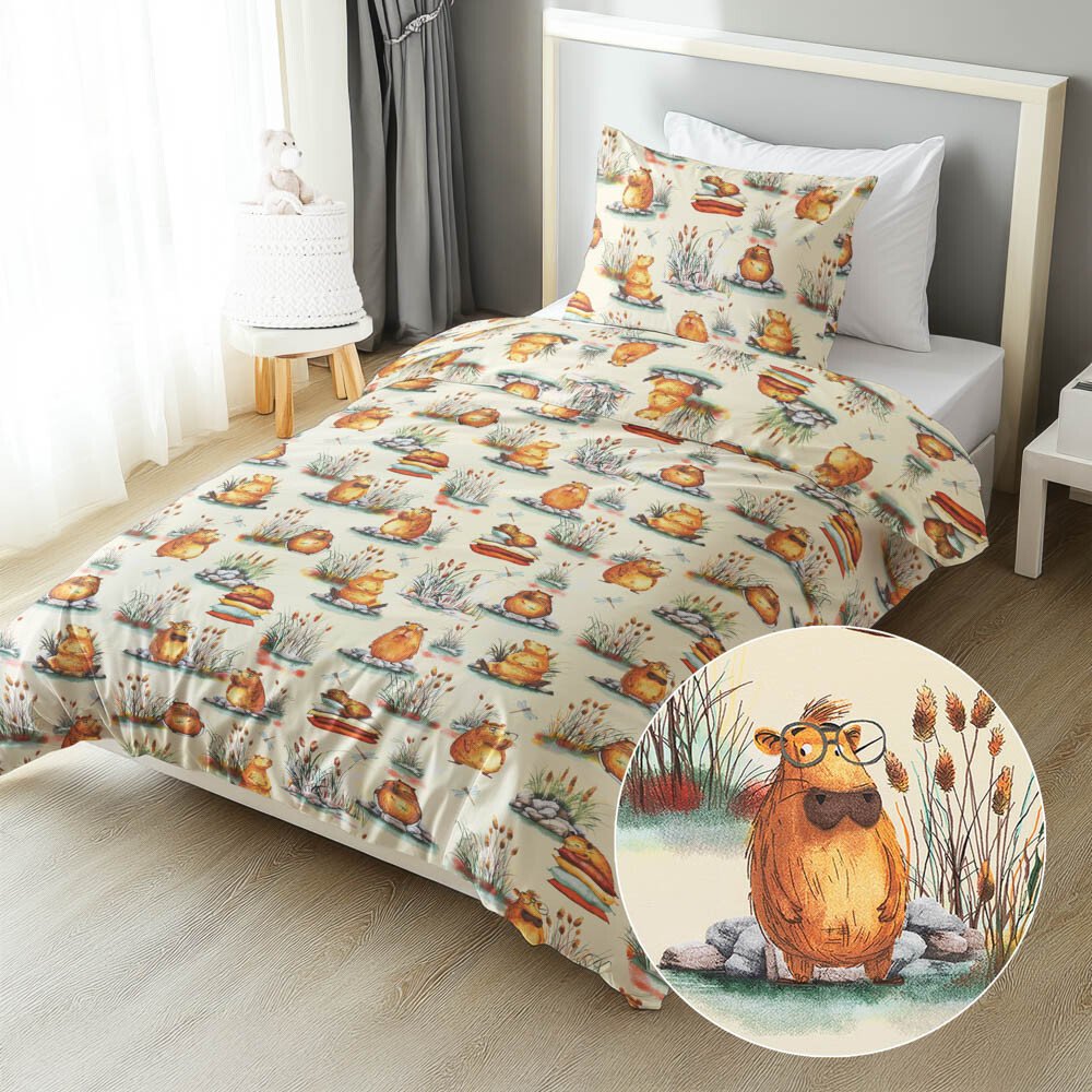 Bavlněné ložní povlečení se vzorem kapybar na krémovém podkladu. Je ušité z hustě tkaného 100% bavlněného plátna s certifikátem zdravotní nezávadnosti Oeko-Tex 100. Bavlněná povlečení jsou vhodná pro celoroční použití.