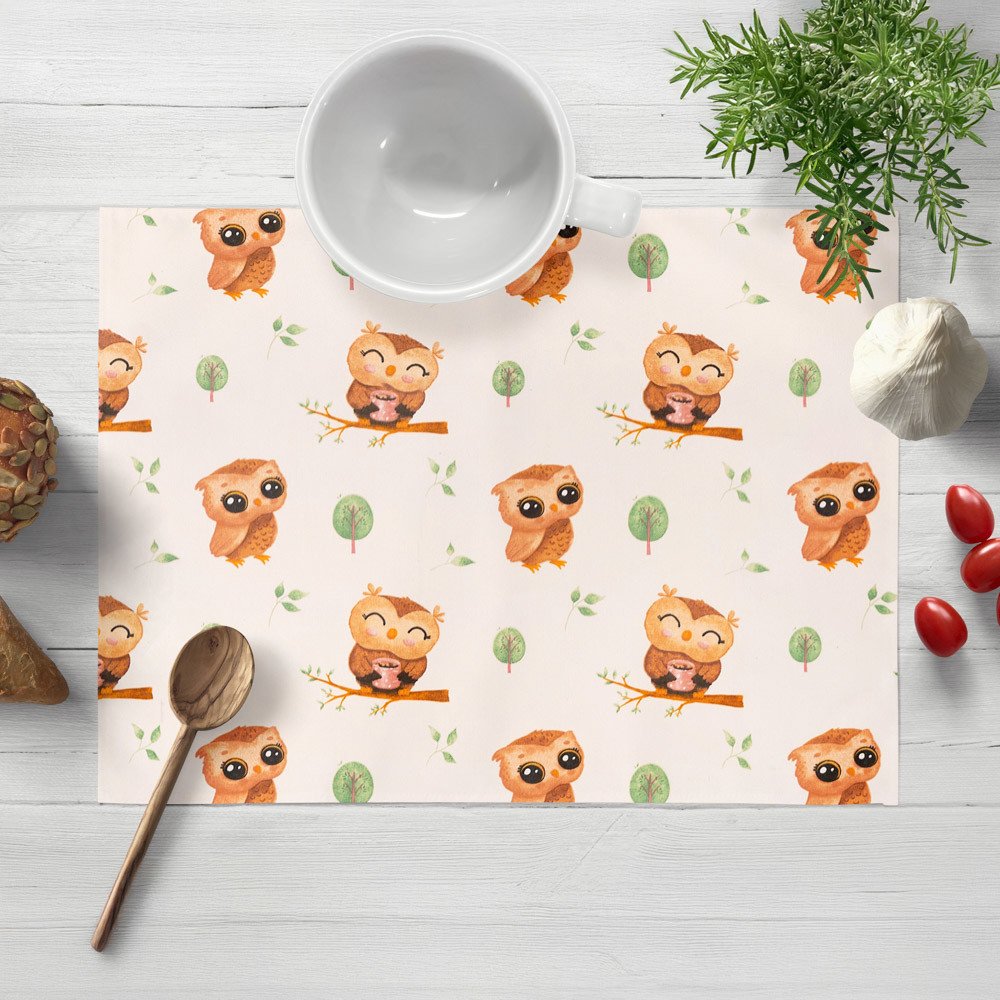 Dětské prostírání na jídelní stůl s milým dětským motivem soviček na větvích na bílém podkladu. Je ušité z hustě tkaného 100% bavlněného plátna s certifikátem zdravotní nezávadnosti Oeko-Tex 100. Prostírání dodáváme kompletně obšité.