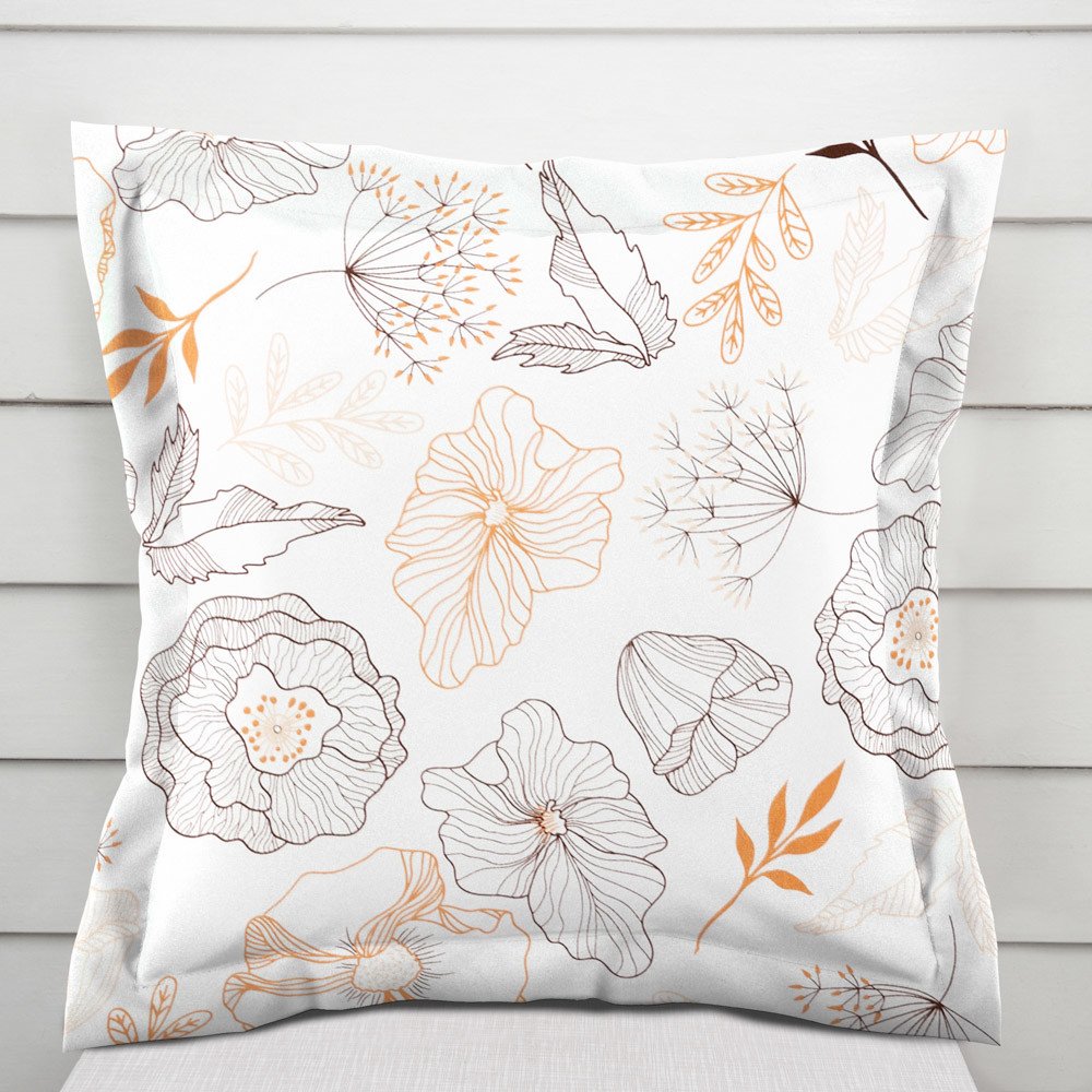 Bavlněný povlak na polštář s ozdobným lemem, se vzorem hnědých a béžových vlčích máků na bílém podkladu. Je ušitý z hustě tkaného 100% bavlněného plátna s certifikátem zdravotní nezávadnosti Oeko-Tex 100. Zapínání na zip je skryté na spodní straně povlaku a neruší tak jeho celkový vzhled. Bavlněná plátna jsou velmi vzdušná a příjemná na dotek.