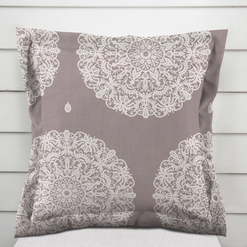 Bavlněný povlak na polštář s ozdobným lemem, se vzorem krémových mandal na béžovošedém podkladu. Je ušitý z hustě tkaného 100% bavlněného plátna s certifikátem zdravotní nezávadnosti Oeko-Tex 100. Zapínání na zip je skryté na spodní straně povlaku a neruší tak jeho celkový vzhled. Bavlněná plátna jsou velmi vzdušná a příjemná na dotek.