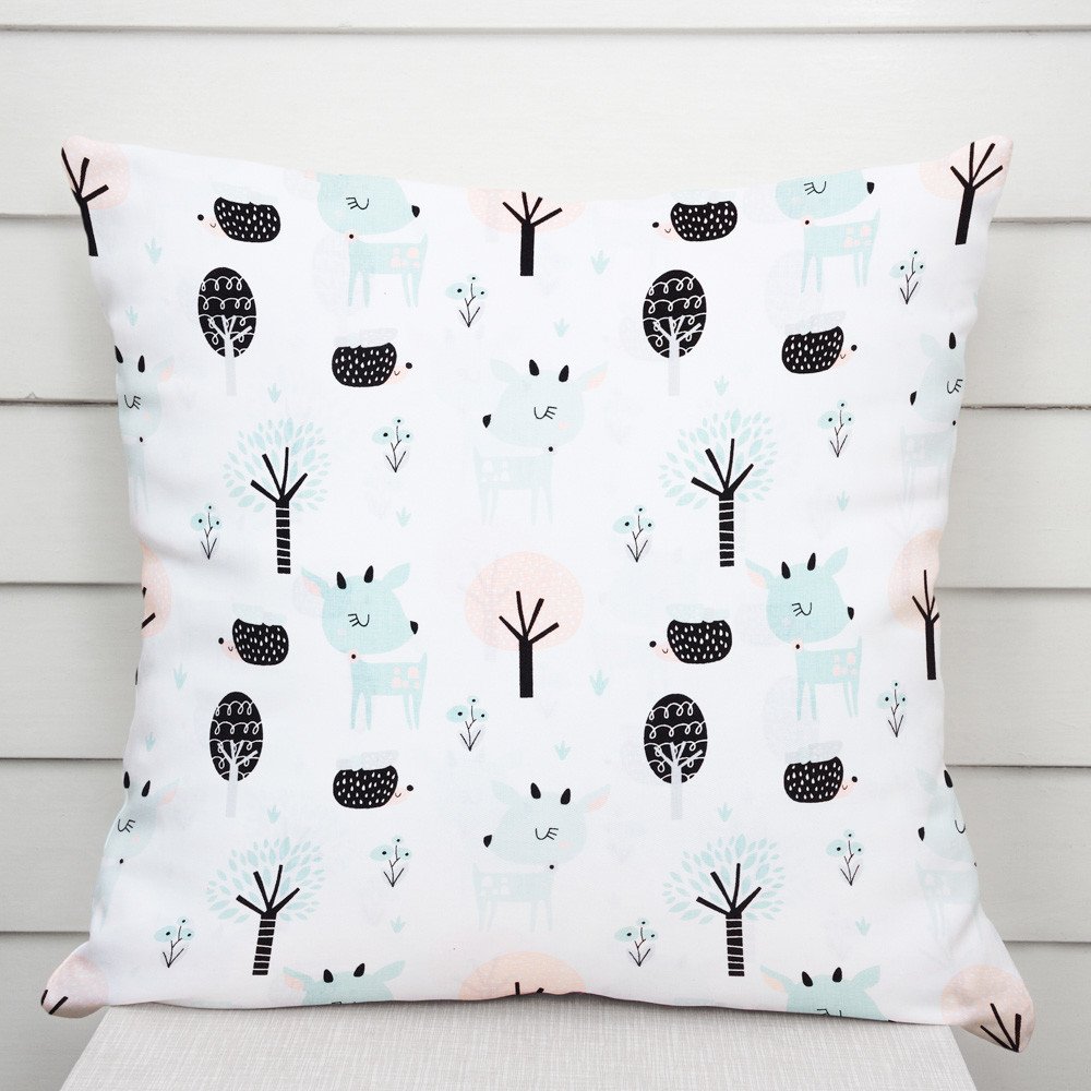 Bavlněný povlak na polštář s milým dětským motivem mintovo-růžových koloušků a ježků v lese na bílém podkladu. Je ušitý z hustě tkaného 100% bavlněného plátna s certifikátem zdravotní nezávadnosti Oeko-Tex 100. Zapínání na zip je skryté na spodní straně povlaku a neruší tak jeho celkový vzhled. Bavlněná plátna jsou velmi vzdušná a příjemná na dotek.