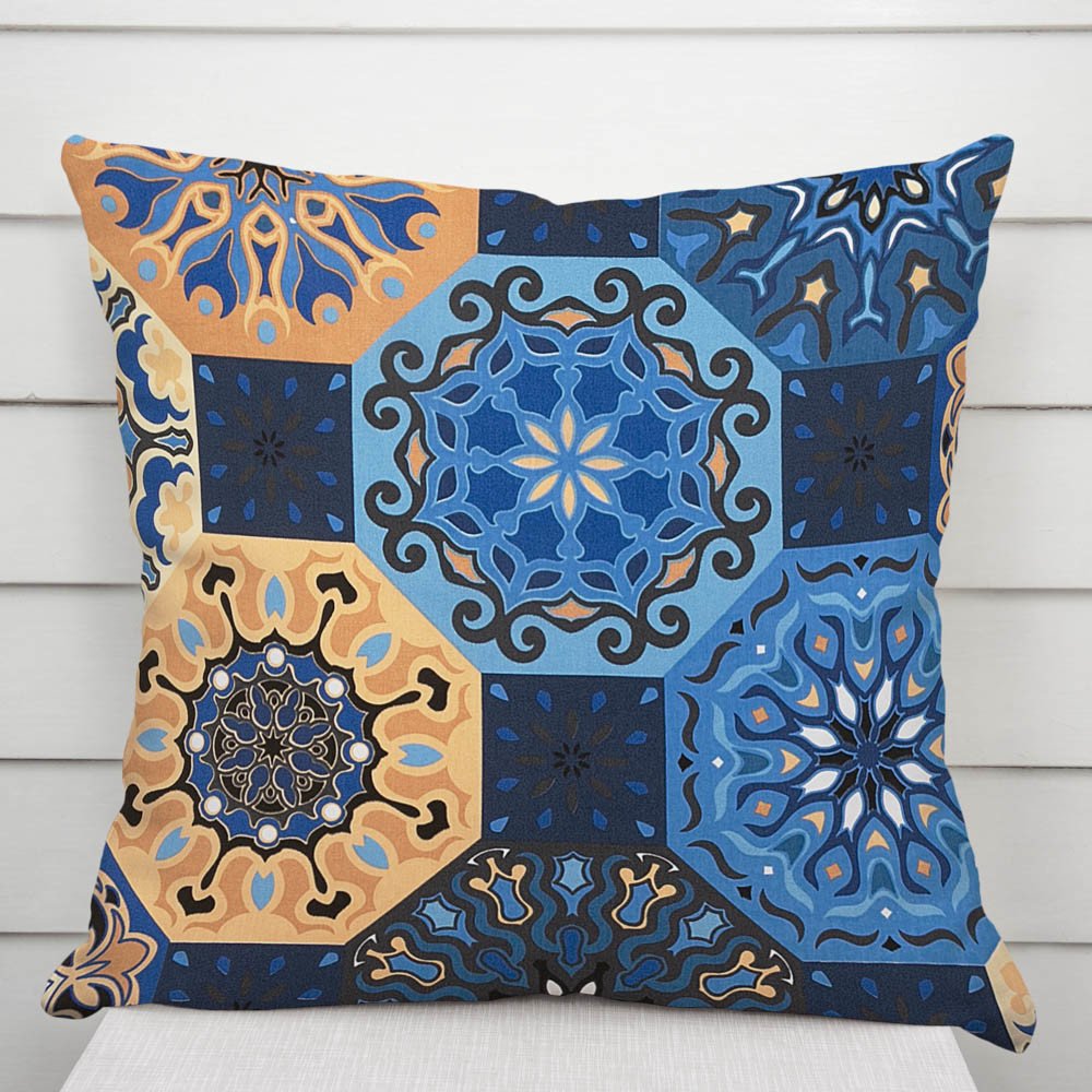 Bavlněný povlak na polštář se vzorem modro-oranžových marockých dlaždic. Je ušitý z hustě tkaného 100% bavlněného plátna s certifikátem zdravotní nezávadnosti Oeko-Tex 100. Zapínání na zip je skryté na spodní straně povlaku a neruší tak jeho celkový vzhled. Bavlněná plátna jsou velmi vzdušná a příjemná na dotek.