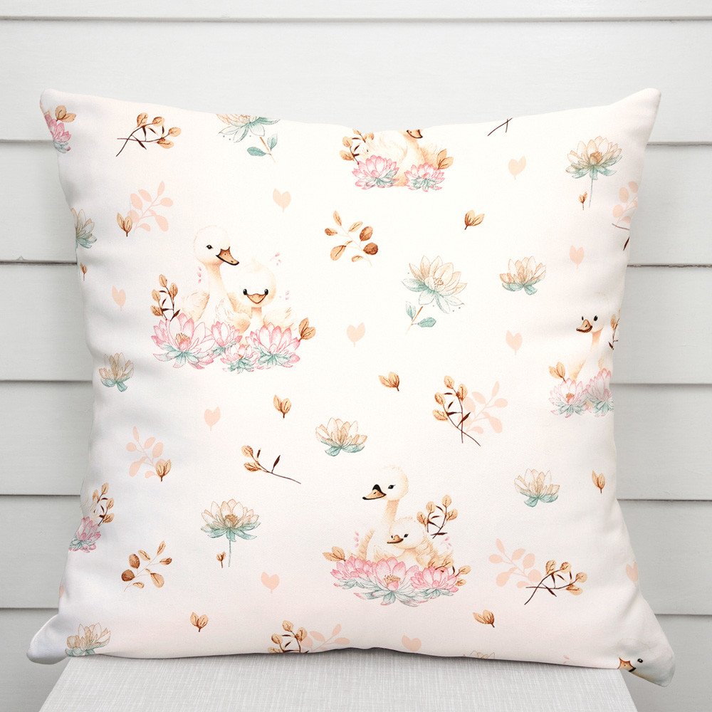 Bavlněný povlak na polštář se vzorem roztomilých labutí v pastelových barvách mezi lekníny na bílém podkladu.