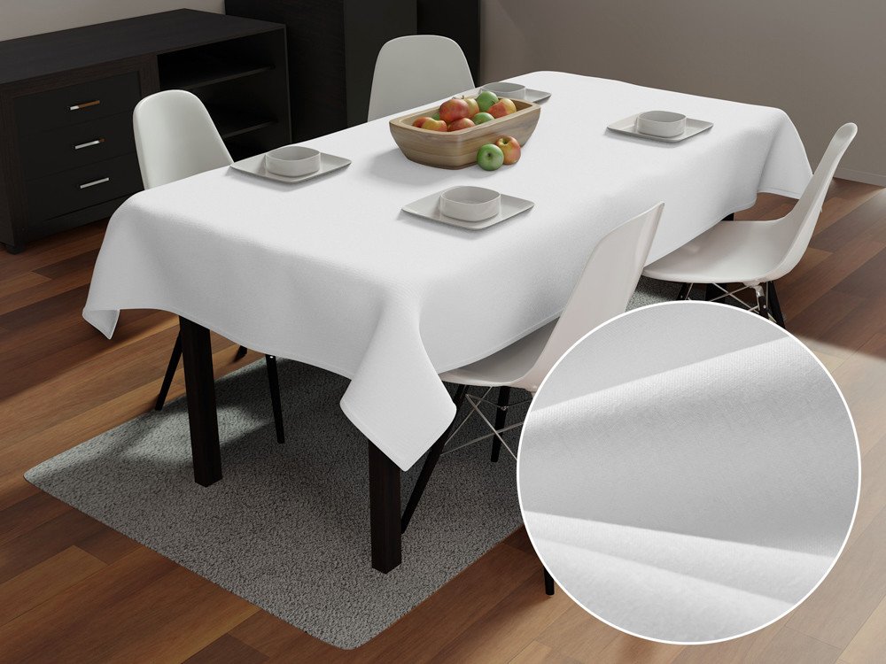 Bavlněný jednobarevný obdélníkový ubrus na stůl v bílé barvě. Je ušitý z hustě tkaného 100% bavlněného plátna s certifikátem zdravotní nezávadnosti Oeko-Tex 100. Ubrus dodáváme kompletně obšitý.