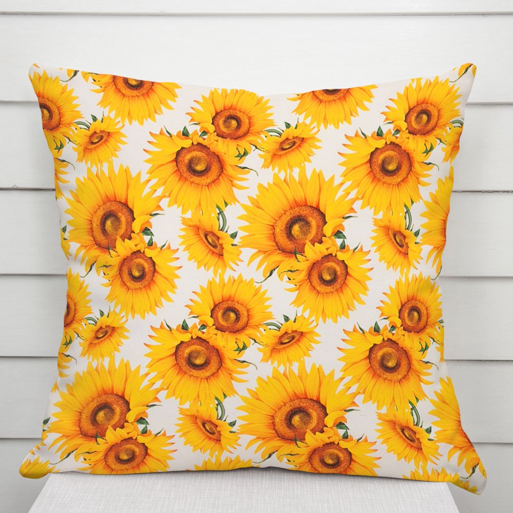 Dekorační povlak na polštář se vzorem slunečnic na bílém podkladu. Je ušitý z kvalitní a pevné dekorační látky s digitálním tiskem, se složením z 40% bavlny a 60% polyesteru. Zapínání na zip je skryté na spodní straně povlaku a neruší tak jeho celkový vzhled.