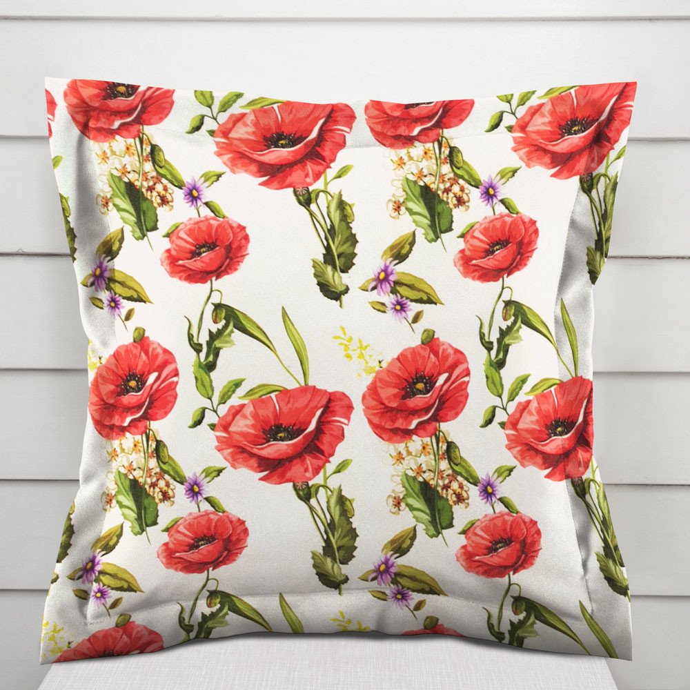 Dekorační povlak na polštář s ozdobným lemem, se vzorem vlčích máků na bílém podkladu. Je ušitý z kvalitní a pevné dekorační látky s digitálním tiskem, se složením z 40% bavlny a 60% polyesteru. Zapínání na zip je skryté na spodní straně povlaku a neruší tak jeho celkový vzhled.