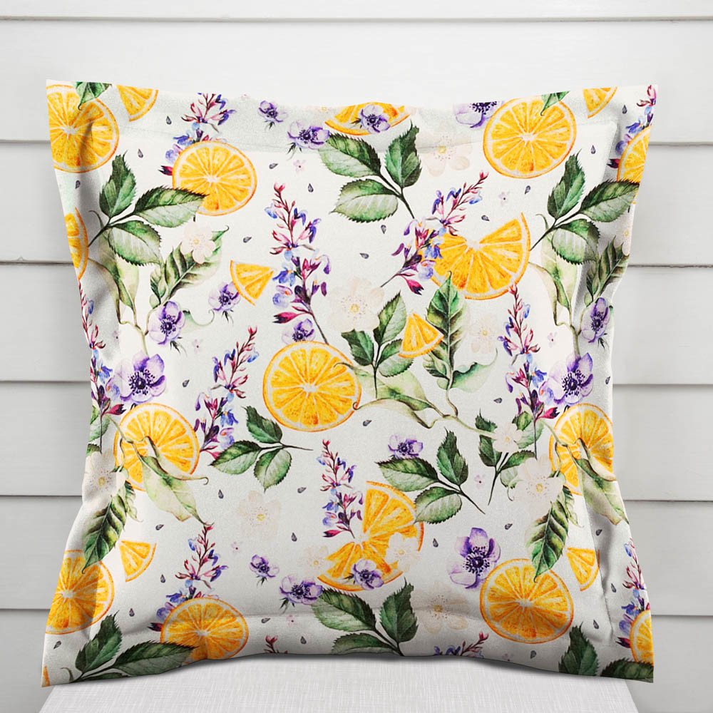 Dekorační povlak na polštář s ozdobným lemem, se vzorem pomerančů mezi květy na bílém podkladu. Je ušitý z kvalitní a pevné dekorační látky s digitálním tiskem, se složením z 40% bavlny a 60% polyesteru. Zapínání na zip je skryté na spodní straně povlaku a neruší tak jeho celkový vzhled.