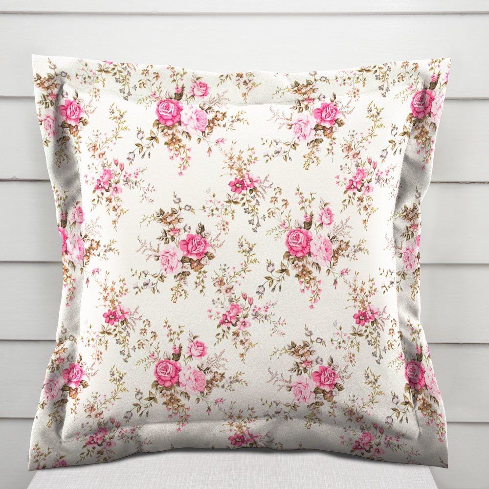 Dekorační povlak na polštář s ozdobným lemem, se vzorem růžových růžiček na bílém podkladu. Je ušitý z kvalitní a pevné dekorační látky s digitálním tiskem, se složením z 40% bavlny a 60% polyesteru. Zapínání na zip je skryté na spodní straně povlaku a neruší tak jeho celkový vzhled.