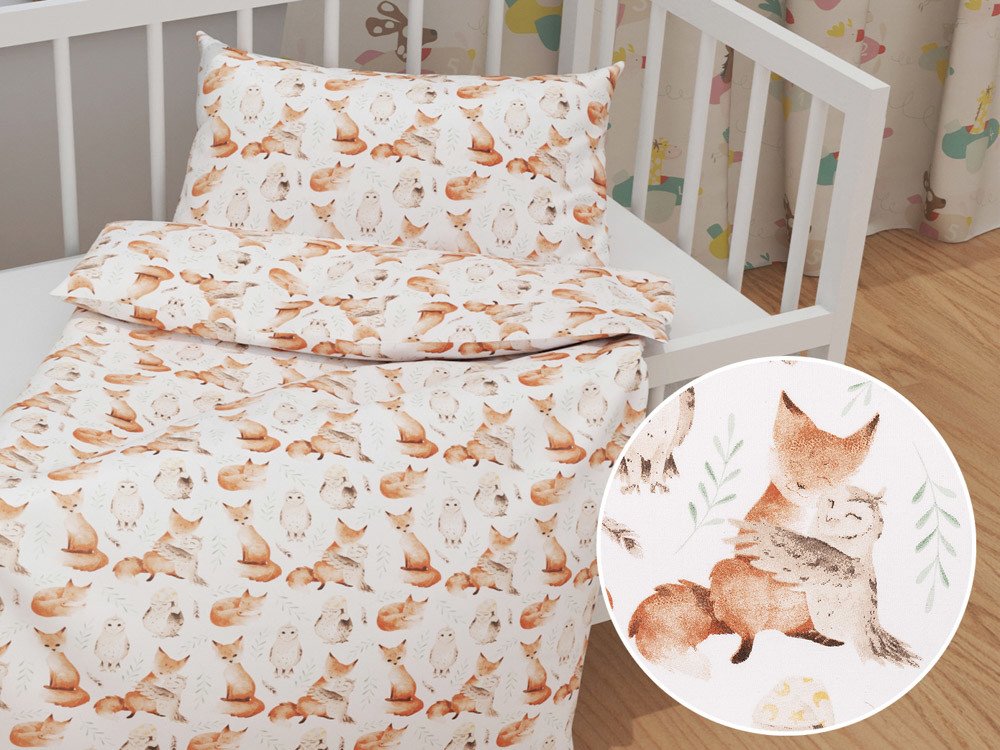 Dětské bavlněné povlečení do postýlky se vzorem lišek a soviček na bílém podkladu. Je ušité z hustě tkaného 100% bavlněného plátna s certifikátem zdravotní nezávadnosti Oeko-Tex 100. Bavlněná povlečení jsou vhodná pro celoroční použití. Zapínání je na zip.