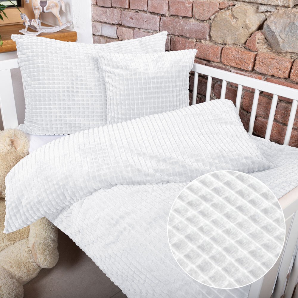 Dětské hřejivé povlečení do postýlky s 3D kostičkovým vzorem v bílé barvě. Je ušité z plyšově hebké a hřejivé polyesterové látky Minky s certifikátem zdravotní nezávadnosti Oeko-Tex 100. Povlečení Minky je vhodné zejména pro chladnější období roku. Zapínání je na zip.