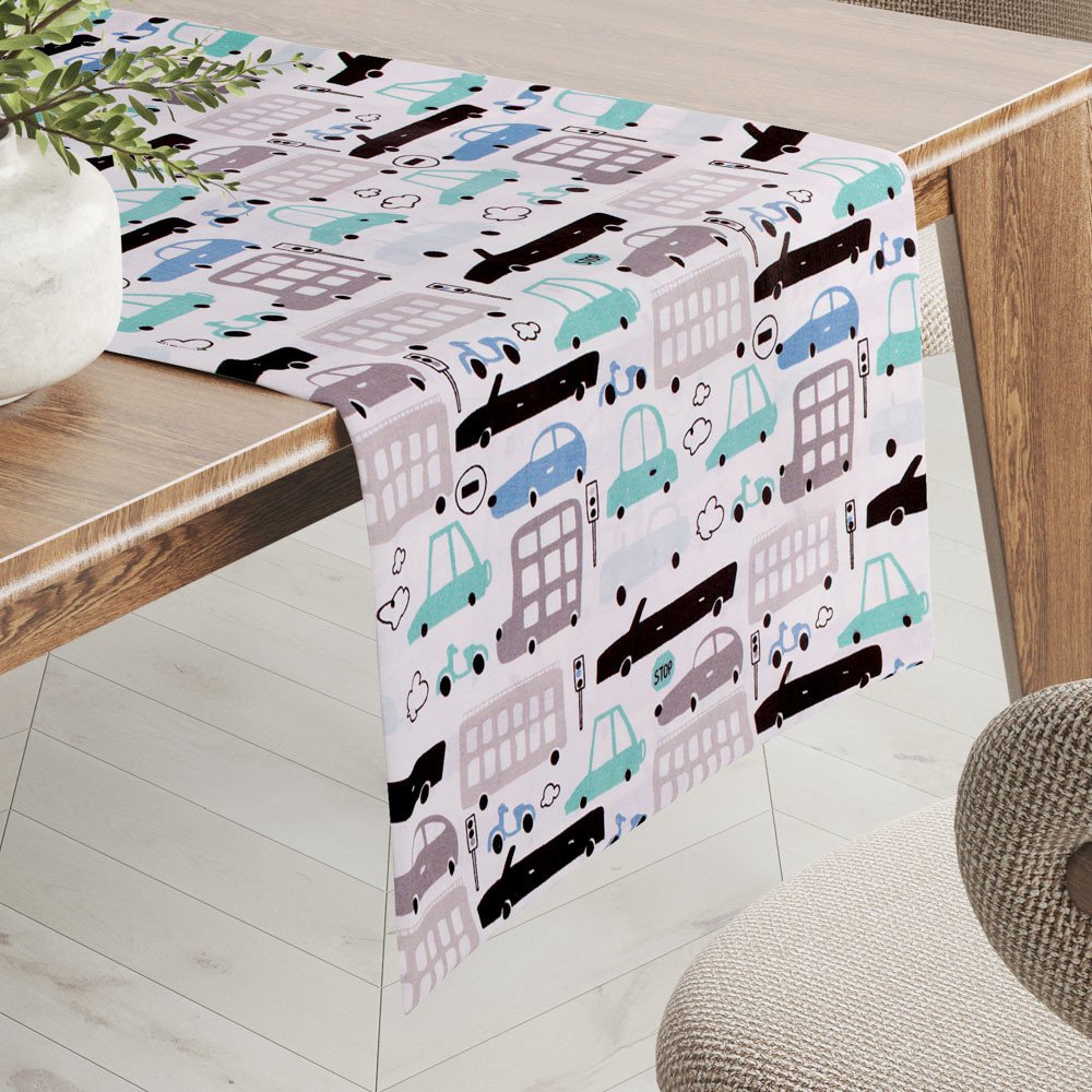 Dětský běhoun na jídelní stůl s milým dětským motivem modrých a šedých autiček a autobusů na bílém podkladu. Je ušitý z hustě tkaného 100% bavlněného plátna s certifikátem zdravotní nezávadnosti Oeko-Tex 100. Běhoun dodáváme kompletně obšitý.