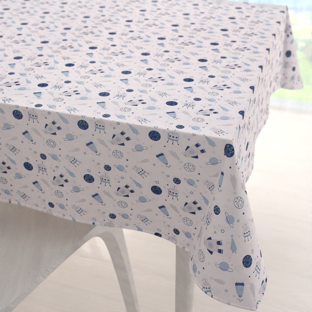 Dětský bavlněný čtvercový dekorační ubrus na stůl s milým dětským motivem modrých a šedých autiček a autobusů na bílém podkladu. Je ušitý z hustě tkaného 100% bavlněného plátna s certifikátem zdravotní nezávadnosti Oeko-Tex 100. Ubrus dodáváme kompletně obšitý.