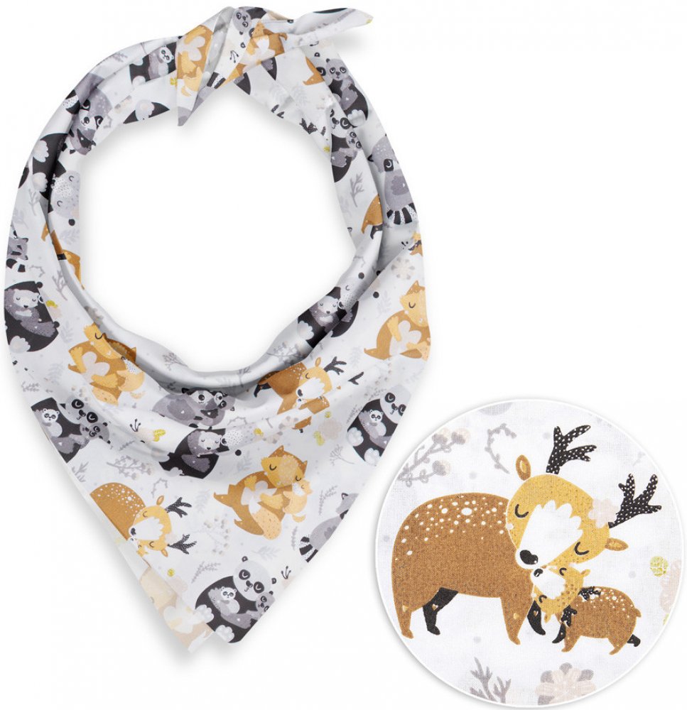Dětský bavlněný šátek s milým dětským motivem zvířátek s mláďátky na bílém podkladu. Je ušitý z kvalitního hustě tkaného 100% bavlněného plátna s certifikátem zdravotní nezávadnosti Oeko-Tex 100.