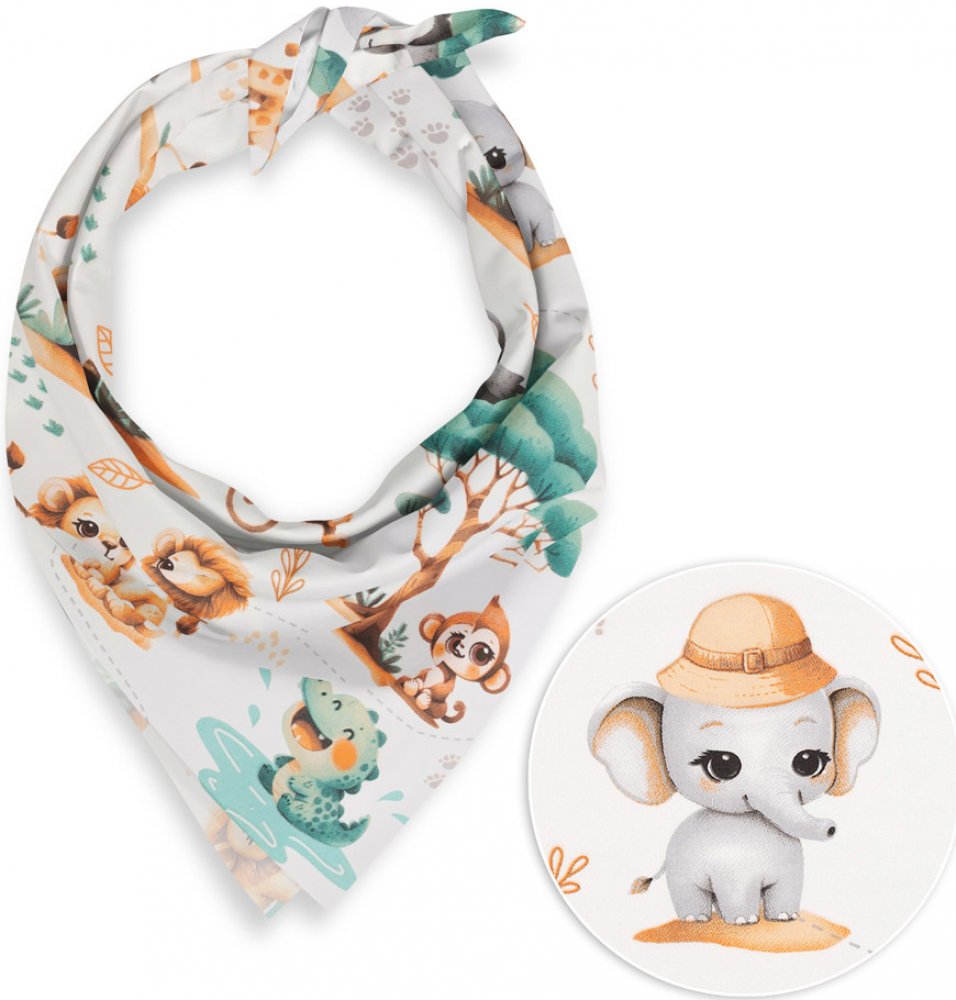 Dětský bavlněný šátek s milým dětským motivem afrických zvířátek na bílém podkladu. Je ušitý z kvalitního hustě tkaného 100% bavlněného plátna s certifikátem zdravotní nezávadnosti Oeko-Tex 100.