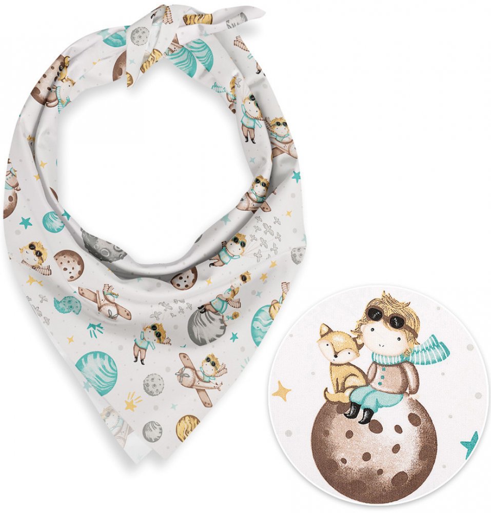 Dětský bavlněný šátek s milým dětským motivem Malého prince mezi planetami v modrozelených, hnědých a šedých barvách na bílém podkladu. Je ušitý z kvalitního hustě tkaného 100% bavlněného plátna s certifikátem zdravotní nezávadnosti Oeko-Tex 100.