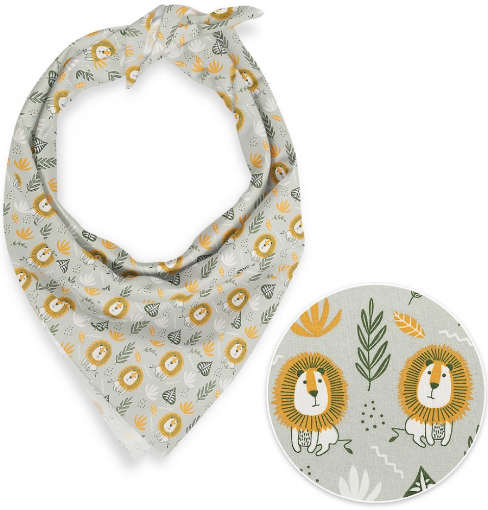 Dětský bavlněný šátek s milým dětským motivem lvů mezi listy, v oranžových, zelených a bílých barvách na světle šedém podkladu. Je ušitý z kvalitního hustě tkaného 100% bavlněného plátna s certifikátem zdravotní nezávadnosti Oeko-Tex 100.