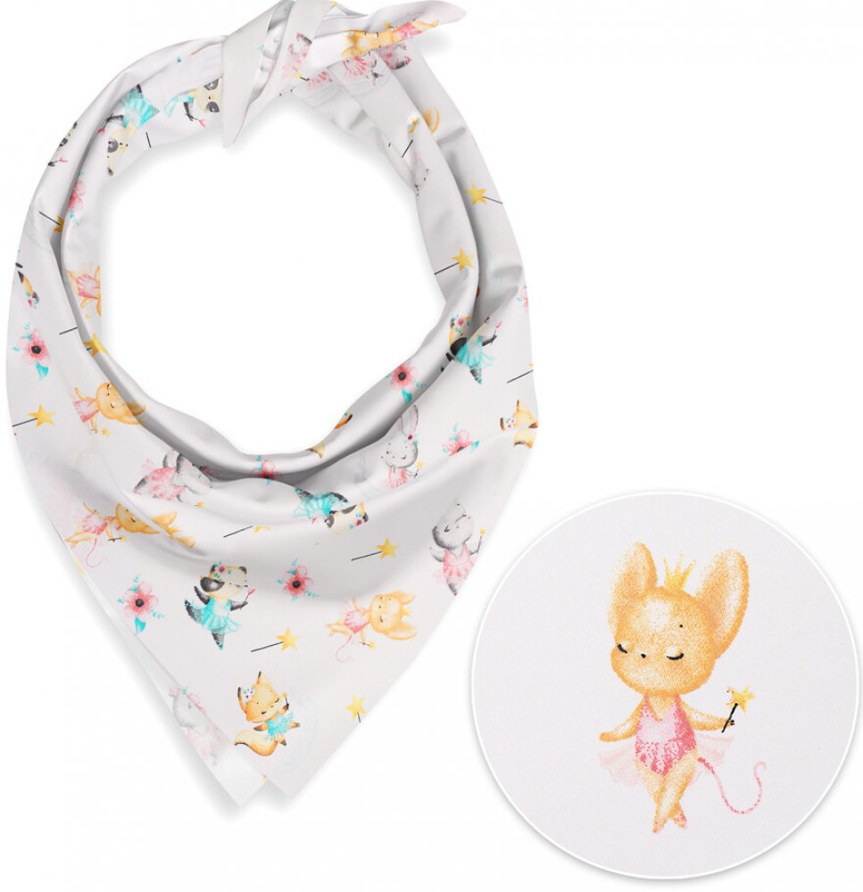 Dětský bavlněný šátek s milým dětským motivem zvířátek baletek v růžovo-tyrkysových barvách na bílém podkladu. Je ušitý z kvalitního hustě tkaného 100% bavlněného plátna s certifikátem zdravotní nezávadnosti Oeko-Tex 100.
