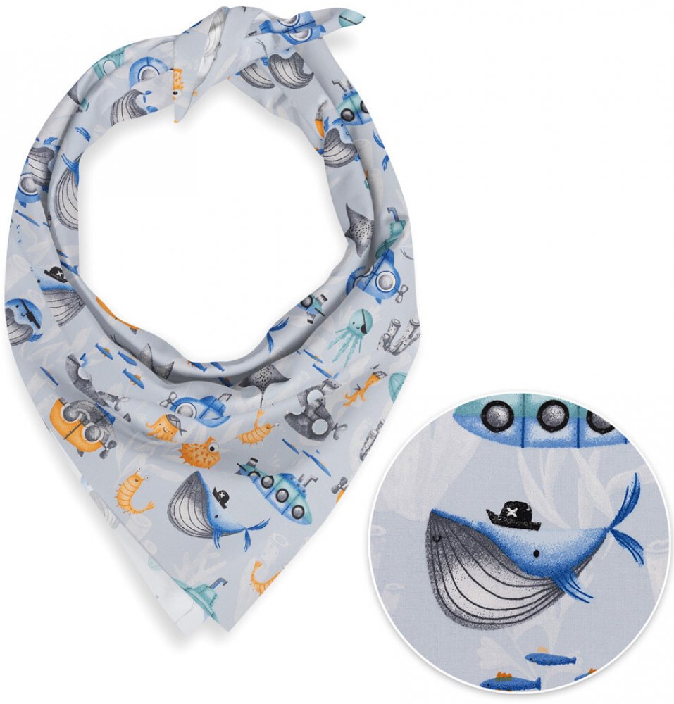 Dětský bavlněný šátek s milým dětským motivem ponorek a velryb na světle modrém podkladu. Je ušitý z kvalitního hustě tkaného 100% bavlněného plátna s certifikátem zdravotní nezávadnosti Oeko-Tex 100.