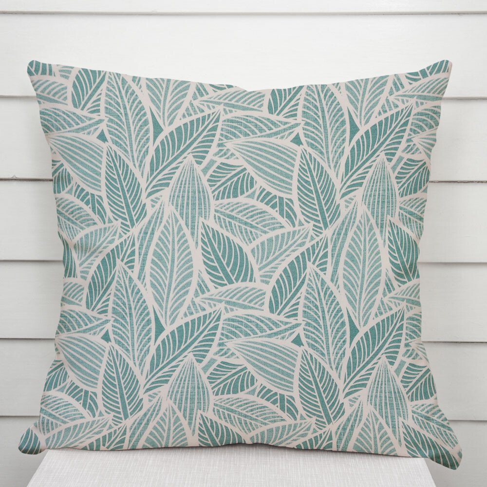 Dekorační povlak na polštář se vzorem bílých listů na modrozeleném podkladu. Je ušitý z kvalitní a pevné španělské látky z 55% bavlny a 45% polyesteru. Zapínání na zip je skryté na spodní straně povlaku a neruší tak jeho celkový vzhled.
