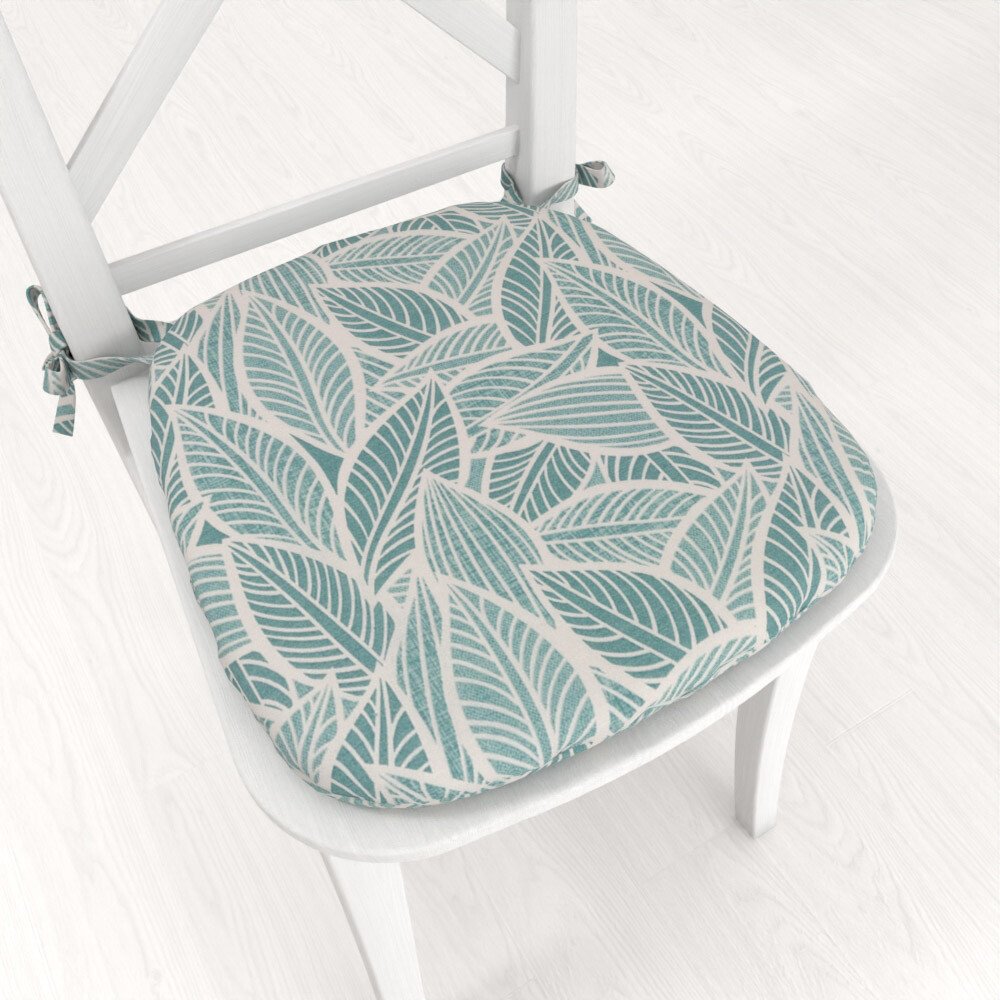 Oblý podsedák se vzorem bílých listů na modrozeleném podkladu. Potah je ušitý z kvalitní a pevné španělské dekorační látky Leona z 55% bavlny a 45% polyesteru o gramáži 190 g/m2. Užší strana podsedáku je opatřena praktickými vázacími šňůrkami v dekoru látky. Výplň podsedáku tvoří kvalitní a tuhý molitanový korpus o tloušťce 3 cm, který je pevně všitý. Potah není snímatelný a výplň nelze z podsedák...