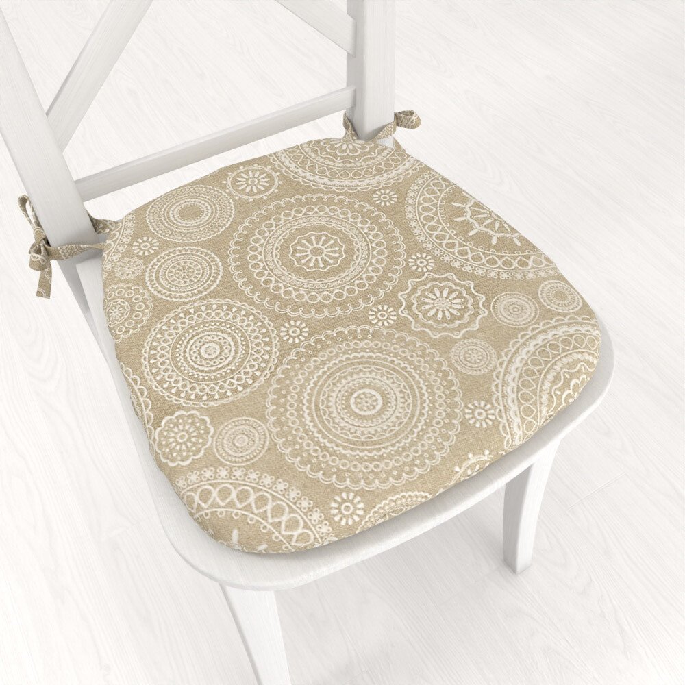 Oblý podsedák se vzorem bílých mandal na režném podkladu. Potah je ušitý z kvalitní a pevné španělské dekorační látky Leona z 55% bavlny a 45% polyesteru o gramáži 190 g/m2. Užší strana podsedáku je opatřena praktickými vázacími šňůrkami v dekoru látky. Výplň podsedáku tvoří kvalitní a tuhý molitanový korpus o tloušťce 3 cm, který je pevně všitý. Potah není snímatelný a výplň nelze z podsedáku vyj...