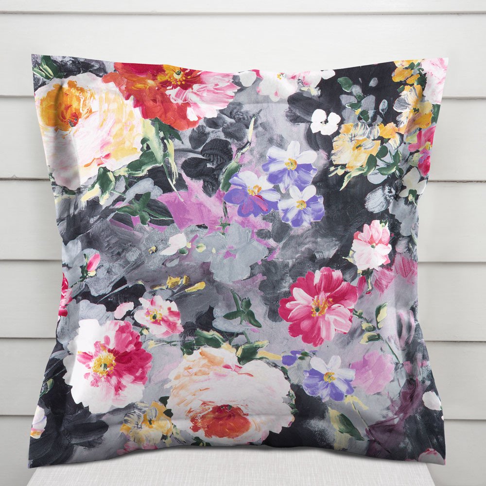 Dekorační povlak na polštář s ozdobným lemem, vyrobený z příjemné dekorační látky s digitálně tištěným vzorem malovaných pestrobarevných květů na šedém podkladu. Povlak je ušit z látky ze 100% polyesteru, o gramáži 180 g/m2.Zapínání na zip je skryté na spodní straně povlaku a neruší tak jeho celkový vzhled.