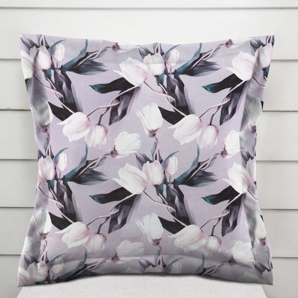 Dekorační povlak na polštář s ozdobným lemem, se vzorem bílých tulipánů na šedém podkladu s fialovým nádechem. Je ušitý z kvalitní a pevné dekorační látky s digitálním tiskem, se složením z 40% bavlny a 60% polyesteru. Zapínání na zip je skryté na spodní straně povlaku a neruší tak jeho celkový vzhled.