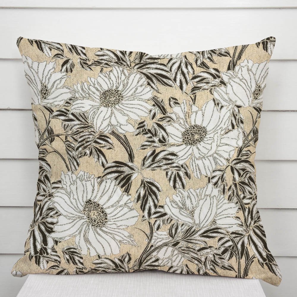Dekorační povlak na polštář se vzorem bílých květin na béžovém podkladu. Je ušitý z kvalitní a pevné dekorační látky s digitálním tiskem, se složením z 40% bavlny a 60% polyesteru. Zapínání na zip je skryté na spodní straně povlaku a neruší tak jeho celkový vzhled.