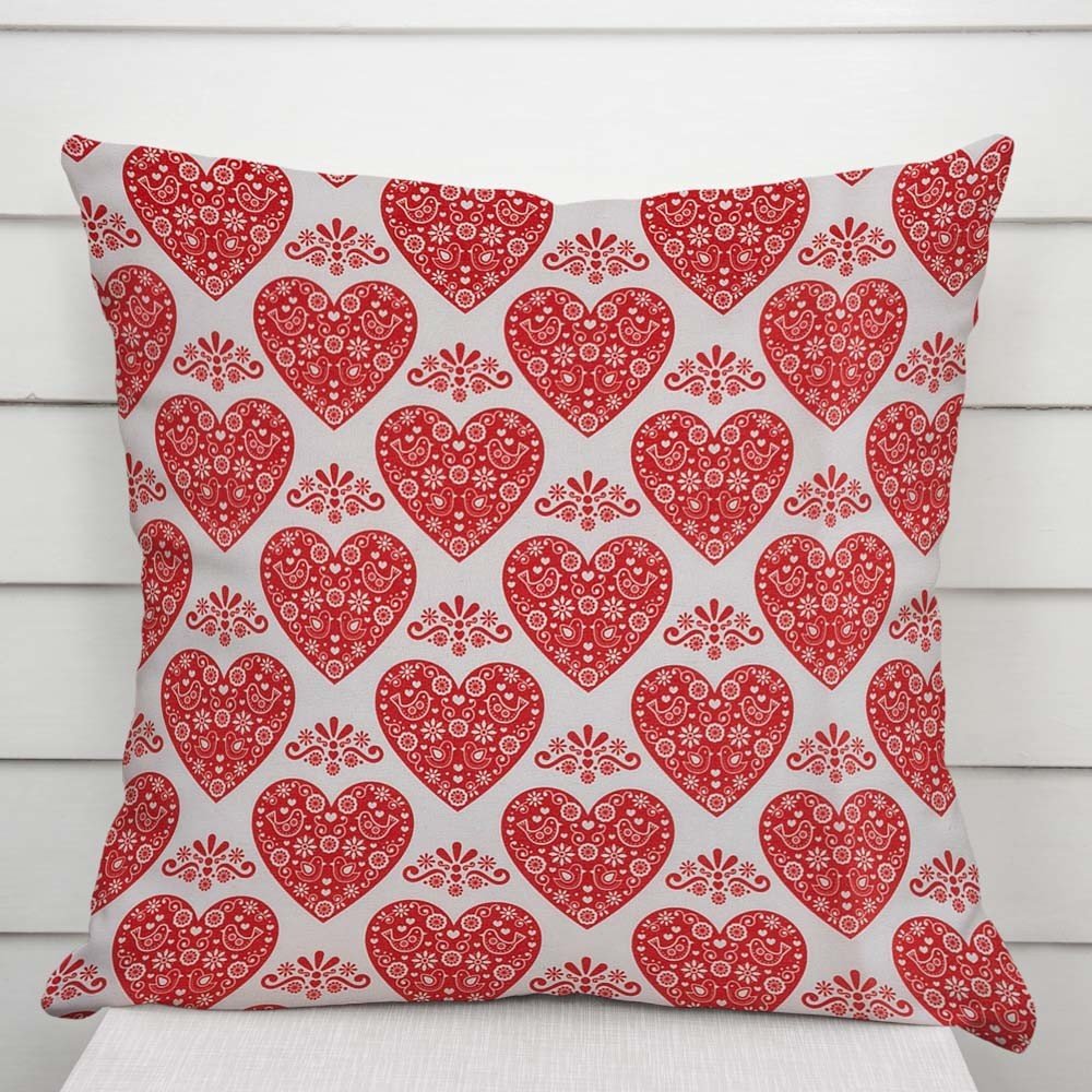 Dekorační povlak na polštář se vzorem červených srdíček s ornamenty na bílém podkladu. Je ušitý z kvalitní a pevné dekorační látky s digitálním tiskem, se složením z 40% bavlny a 60% polyesteru. Zapínání na zip je skryté na spodní straně povlaku a neruší tak jeho celkový vzhled.